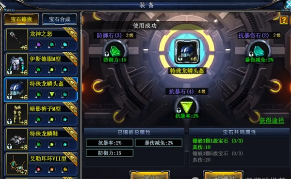 防御部位(头盔、盔甲、腰带、靴子):这类装备需要镶嵌防御石、防爆石、抗爆伤石, 建议优先堆防御和抗暴来提升生存能力