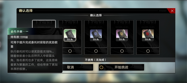 (在委托界面点击开始挑战后会弹出委托手册使用界面)