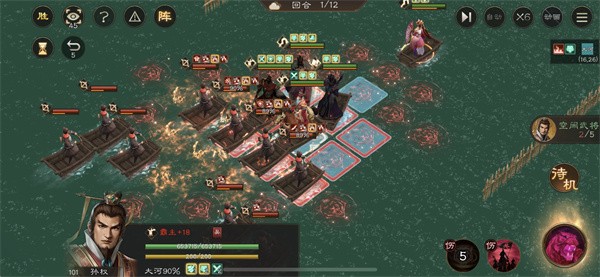 第二回合孙权去右边1技能给敌人挂流血,李儒上去大挂毒,周瑜走到图里位置开大。
