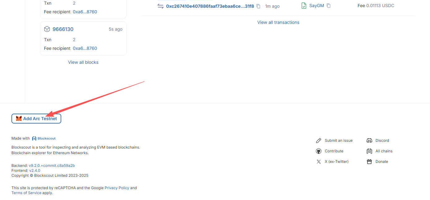 STEP 1. 在签报中添加 Arc 测试网络( https://testnet.arcscan.app/ ),将页面拉到最下面,在左下角点击 Add Arc Testnet,弹出签报确认即可。