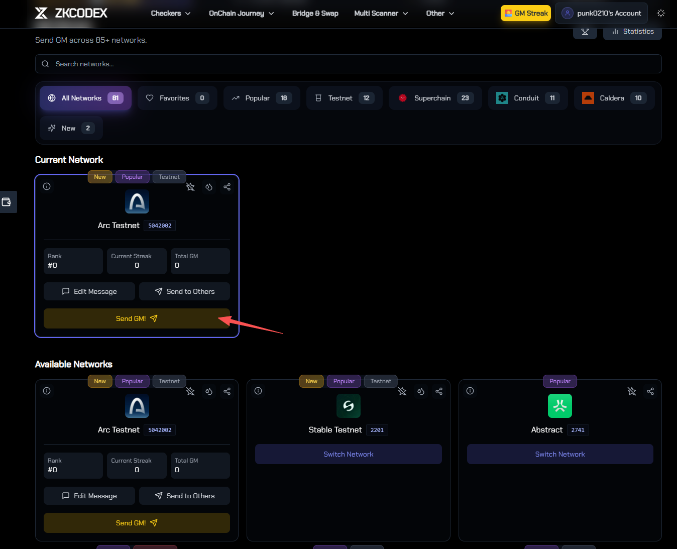 STEP 5. 在 ZKCODEX 平台中选择 Arc 测试网发送 GM(链接: https://zkcodex.com/onchain/gm ),连接签报后找到 Arc Testnet,点击 Send GM,弹出签报确认即可。