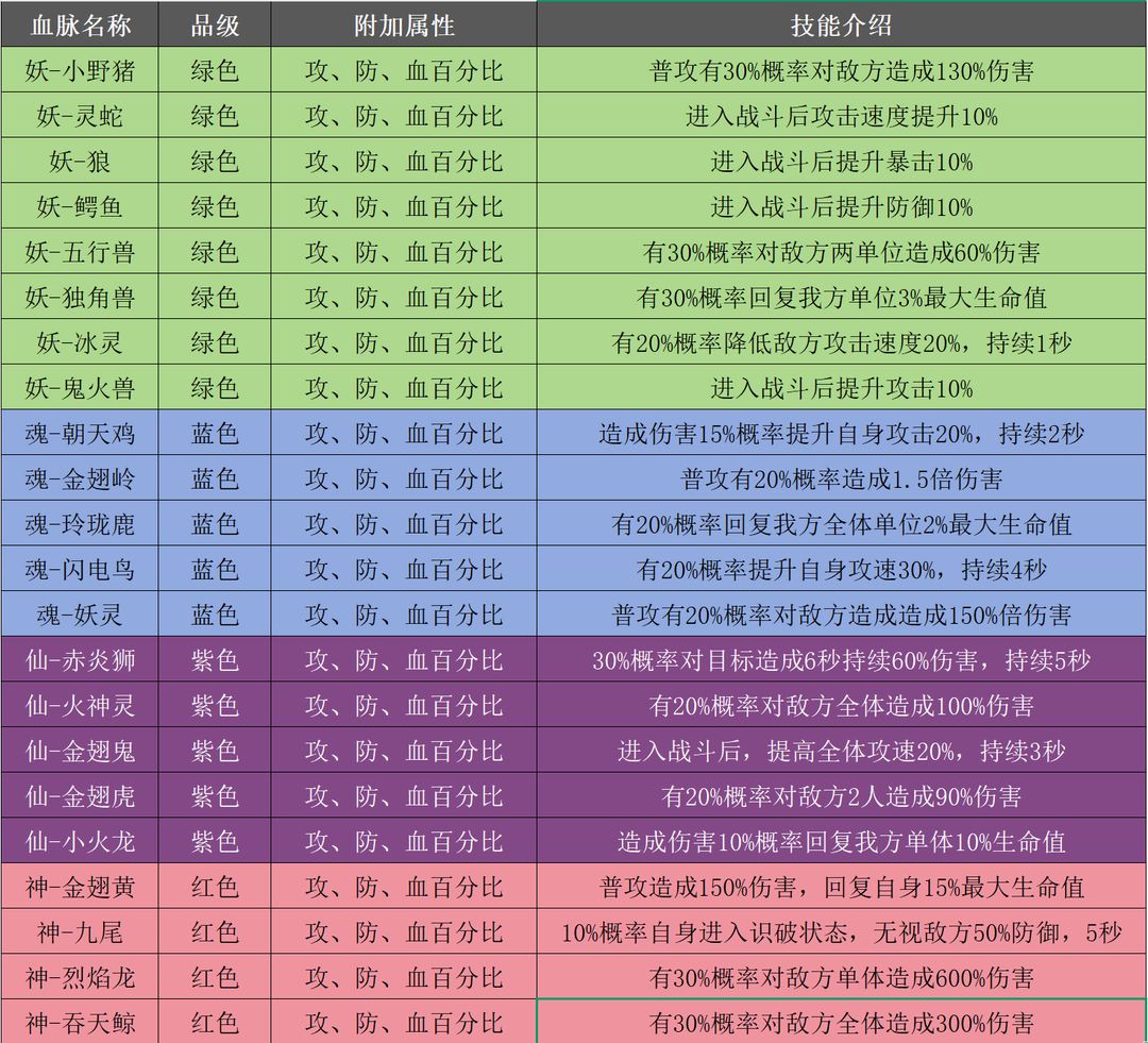 血脉分为绿色-蓝色-紫色-红色血脉,依次属性越高