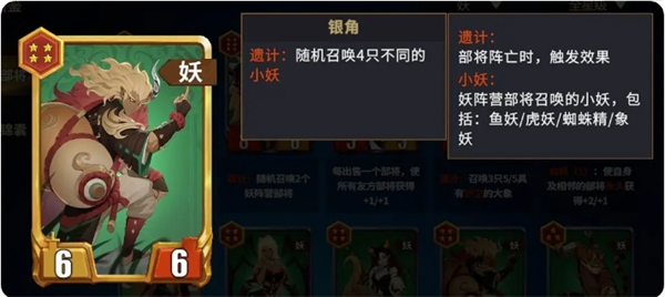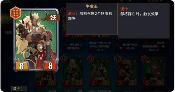 6星牛魔王:召唤随机2个妖族牌。不包含自身共计17张妖族牌,其中白板卡有9张,毒药1张,不屈3张,守卫1张,带遗计召唤物的牌4张,一半的概率出白板,收益一般,6星性价比低。