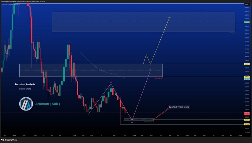 ARB周线图显示,在开启大幅反弹前可能仍需对下方支撑位进行最终测试。Render With Me强调的支撑区域位于0.165至0.170美元附近,这是此前需求区间的底部。
