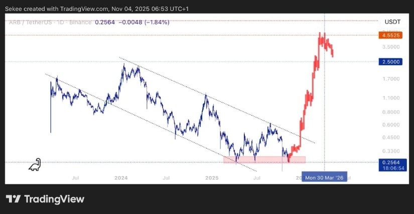 S E K E E的宏观分析指出,当前价位存在17倍上涨空间。图表显示清晰的下降通道突破场景,ARB初期目标4.50美元,若遇强劲"山寨币季节"可能上探6.30美元。