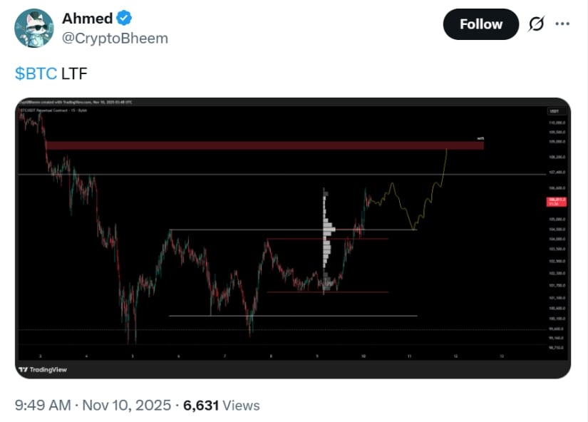BTC从10.6万回撤至10.45万但保持看涨趋势线;日内收盘因美国停摆乐观情绪上涨4%至106,033美元。来源:Ahmed via X