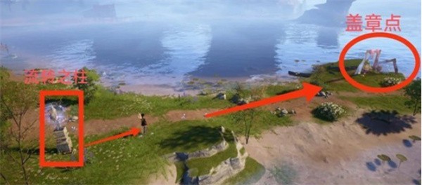 传送至星空钓场锚点后,向后转沿小路前行,盖章点位于水边的尽头处。