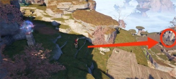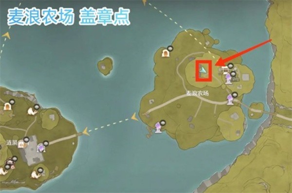 传送至麦浪农场后向后转,沿右下方平台漂浮前进,经过气流柱即可到达盖章点位置,位于石屋前方。