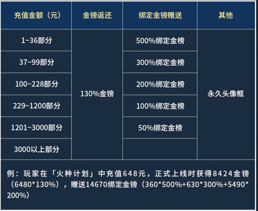 详细返还举例:探险家如在「火种计划」中充值648元,可在正式上线时获得金镑数量=648×10×130%=8424金镑,获得绑定金镑数量=36×10×500%+63×10×300%+129×10×200%+420×10×100%=10470绑定金榜。