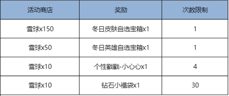 冬日皮肤自选宝箱:打开后可选择以下奖励之一:沈梦溪-龙舞盛年、刘禅-唤灵魔甲、张良-缤纷绘卷、刘备-纽约教父、皮肤碎片x10冬日英雄自选宝箱:打开后可选择以下奖励之一:沈梦溪、刘禅、张良、刘备、英雄碎片x5