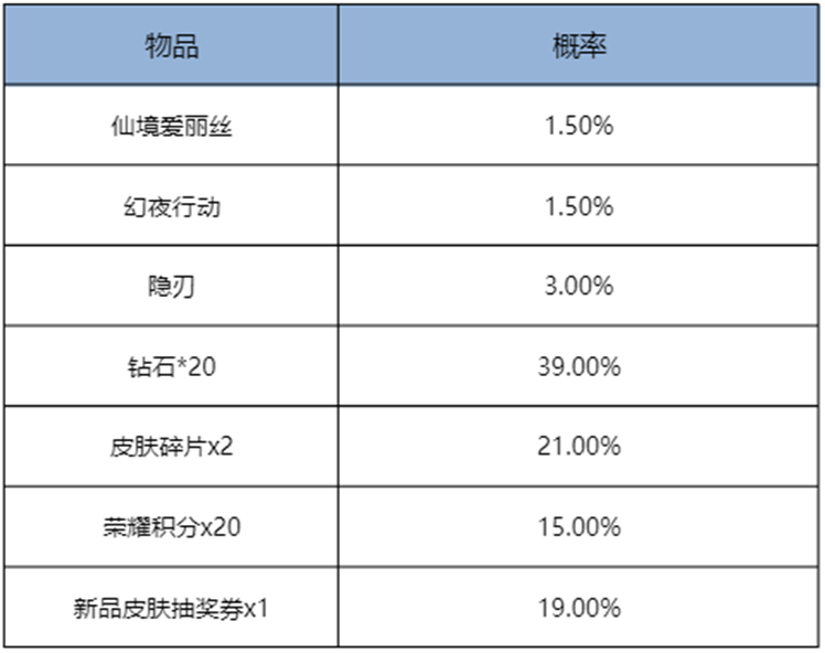 购买红蓝对决(1日),可额外获赠一个礼包,打开后可随机获得以下之一:仙境爱丽丝、幻夜行动、隐刃、皮肤碎片x2、荣耀积分x20、新品皮肤抽奖券x1、钻石x20。累计100次必得仙境爱丽丝和幻夜行动。