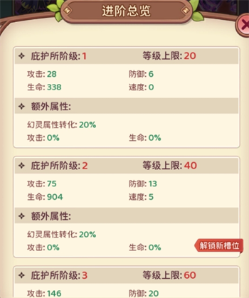 2.进阶收益:获得基础属性,达到指定阶数时还可以提升幻灵属性转化率和攻击/生命百分比属性加成。到达对应等级时会解锁上阵幻灵槽位