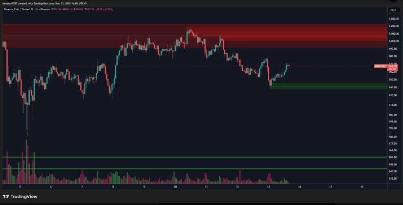 2025年11月13日,加密市场分析师CW在X平台指出945-950美元区域存在显著买盘墙,强调该区间在日内回调中持续吸引资金进场。其币对图表显示该支撑带历经多次测试,每次均出现明显的买方吸纳——这种形态通常出现在盘整阶段的结构性支撑位。