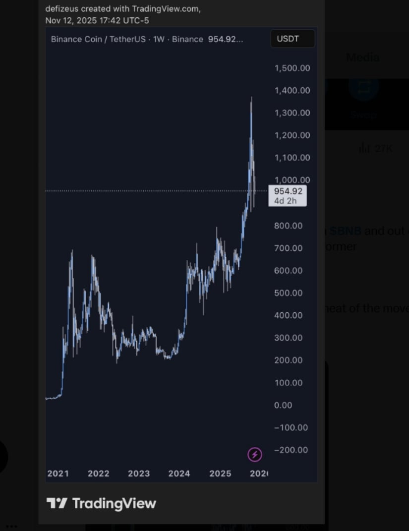 长期市场分析师Zeus在X平台指出,BNB仍处于主流数字资产中最持久的数年上升趋势中。根据其周线图表,该代币从2024年初的300多美元区间攀升至2025年的1300美元上方,当前回调至950美元附近。