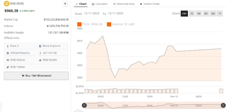 根据2025年11月13日BraveNewCoin数据,BNB/USD从早盘940美元附近的低点反弹,日内交易于960-970美元区间。24小时形态显示低位需求逐步增强,在均衡订单流的支撑下形成稳定的日内结构。