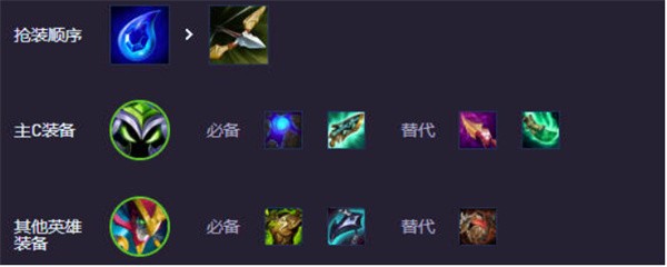 核心输出维迦必备:蓝色暴君护符(技能循环快速启动)、海克斯科技枪刃(持续力和团队治疗)、世界毁灭者帽子/巨人杀手(根据对手阵容选择)