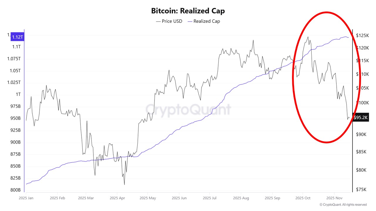 已实现市值指标显示,回调期间仍有新资金入场。但短期持有者的投降性抛售与长期持有者的持续派发,最终导致比特币从126,000美元区域急速下挫。