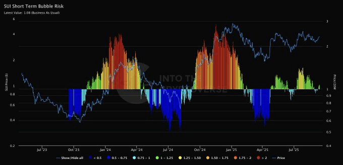 SUI的短期泡沫风险值为1.08,该区域在过去行情中曾标志周期转折。图表通过色带系统追踪SUI价格走势,呈现数月间的压力与冷却节点。该结构覆盖2023年初至2025年中期,显示风险波动的周期性涨落规律。