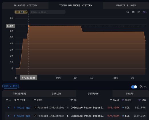 行业最大的SOL财政储备公司Forward Industries正在实施新一轮抛售。此举正值Solana获得越来越多机构关注、链上活动激增之际,使得抛售决策出人意料,值得密切追踪。