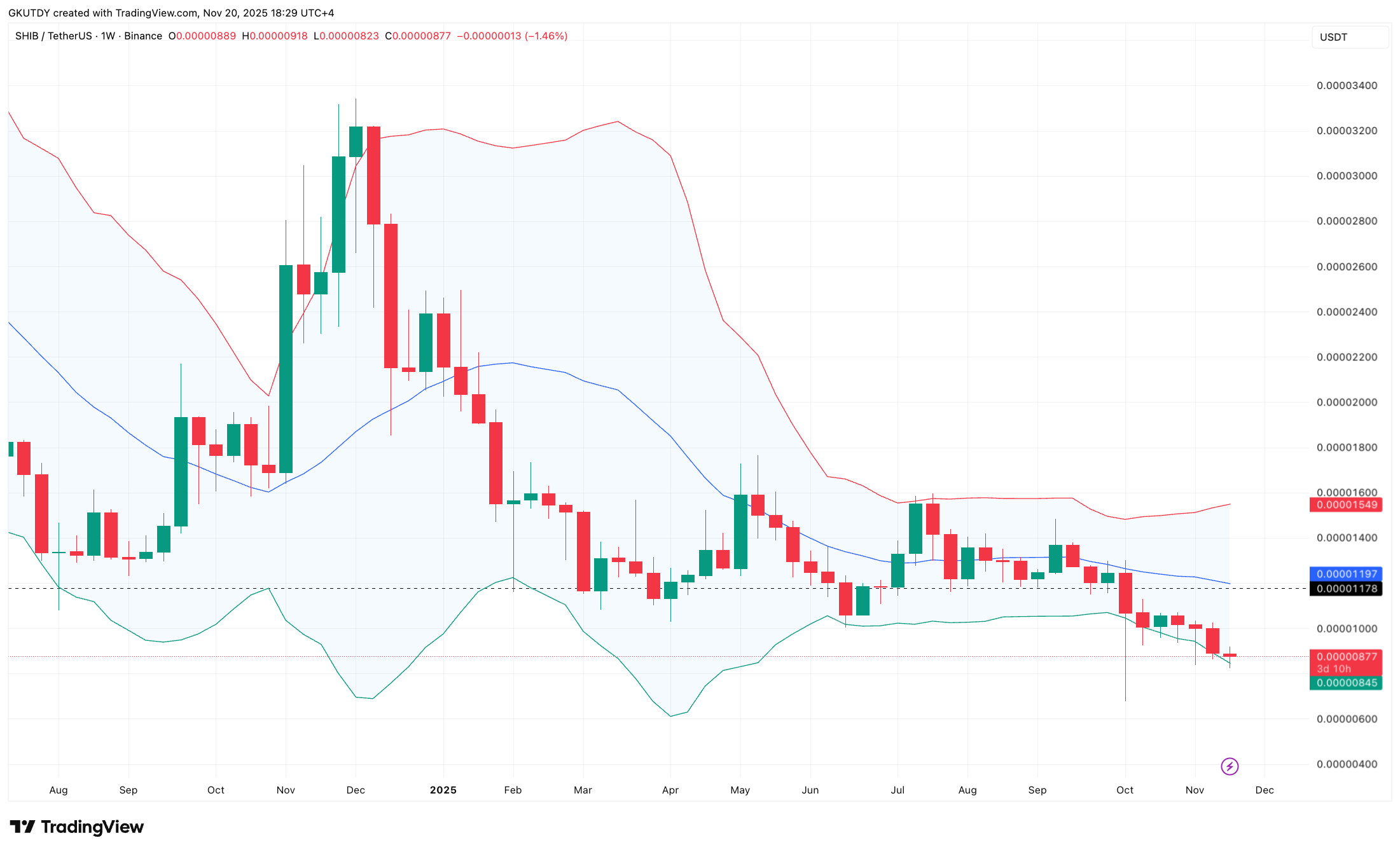 月线图勾勒出完整边界:中轨位于0.00001580美元高位——这是最佳情景的路径,需从当前价位飙升超80%才能使SHIB重回长期牛市格局。
