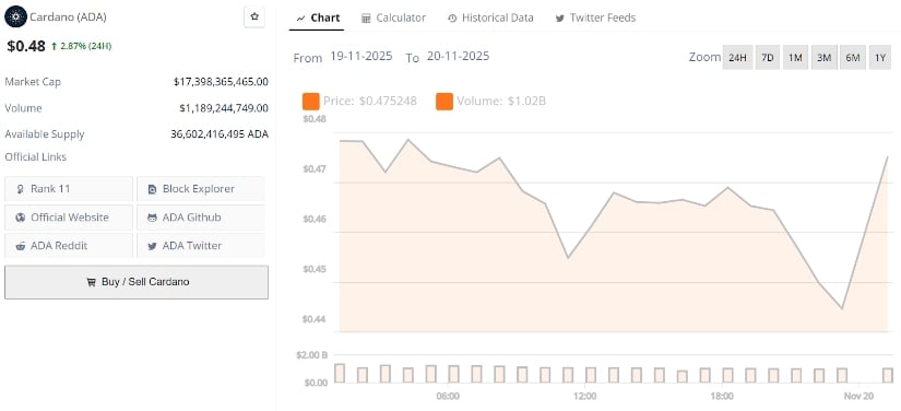 卡尔达诺现报0.48美元,24小时涨幅2.87%。数据来源:Brave New Coin