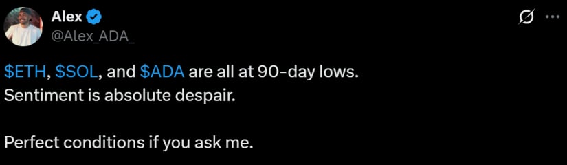卡尔达诺价格现处于90日低点的深度投降区,该区域在过往周期中屡次引发剧烈反弹。数据来源:Alex via X