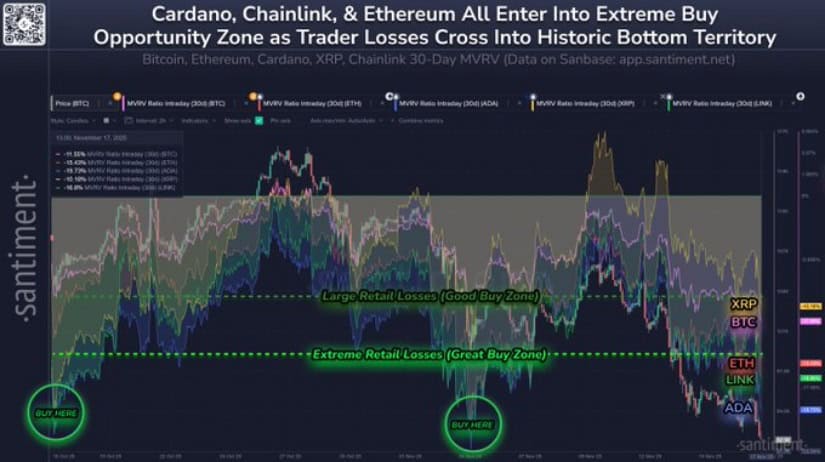 ADA的30日MVRV已跌入极端买入区,该水平在过往周期中多次触发强劲反弹。数据来源:Coin Bureau via X