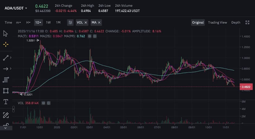 卡尔达诺价格现处于宏观支撑、链上价值区与情绪投降的三重交汇点,这些要素曾多次塑造周期中段反转。ADA图表显示价格可能再探0.36-0.40美元流动性区,但整体结构已愈发呈现重置成熟度。