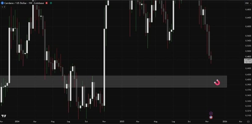 ADA周线图凸显指向0.36-0.40美元的关键需求区块,这是Smcapitalclub结构中的下一主要流动性区域。数据来源:Smcapitalclub via X