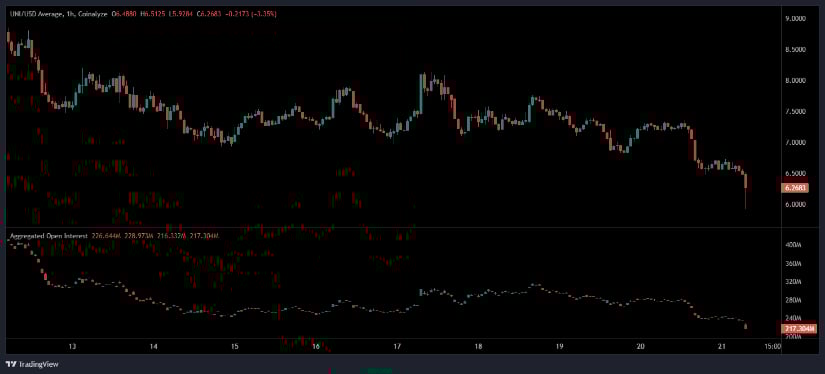 UNI的持续暴跌迫使交易者转入防御姿态,未平仓合约稳步下降,在缺乏看涨信心的情况下波动性逐渐冷却。