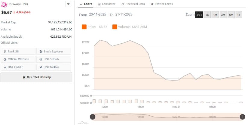 BraveNewCoin数据显示Uniswap现报6.67美元,过去24小时下跌8.39%。代币市值维持在41.9亿美元,流通供应量为6.2989亿枚。6.21亿美元的交易量仍处高位,表明尽管趋势向下,市场参与依然活跃——但流动性更倾向于抛售而非吸筹。