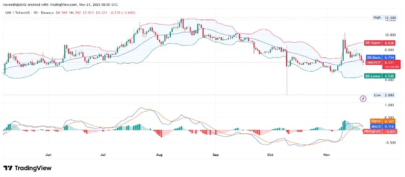 TradingView的UNI/USDT图表显示该代币交投于6.273美元附近,日内下跌4.52%。价格走势位于布林带基线6.731美元下方,这是短期趋势转熊的明确技术信号。在8.937美元上轨附近的强烈拒止,以及向4.525美元下轨的稳步移动,表明由卖方主导的波动性正在增强。