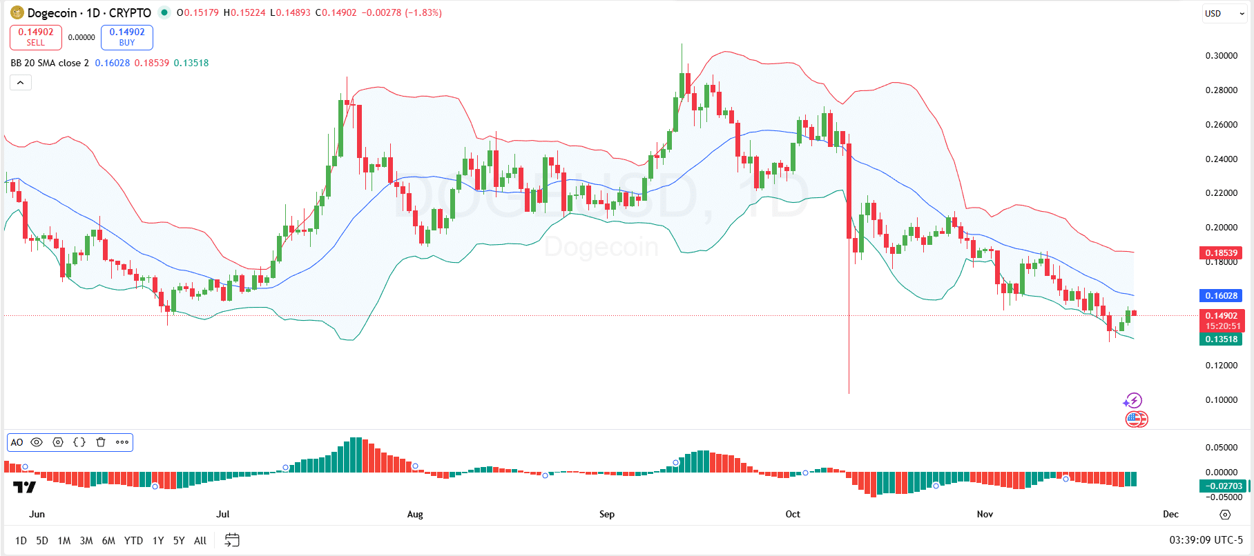 价格曾短暂跌破下轨(通常预示超卖),随后反弹至0.150美元附近。但中轨(即20日简单移动平均线SMA)仍高居0.16028美元,构成强劲动态阻力位——DOGE必须突破该位方能冲击0.185美元的上轨。只要价格持续低于该SMA,看跌动能就将占据主导。