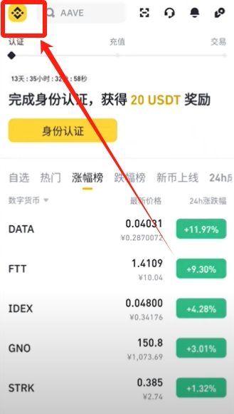 第三,我们可以尝试着去清理缓存,并且重新启动币安APP。我们点击左上角的币安logo。