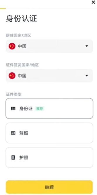 清理完成之后,我们再把APP关掉。然后再重新打开币安,在这个状态下就会重新跳出来让我们去做身份认证的流程了。接下来我们就可以按照他的步骤,一步一步的去进行身份认证就可以了。