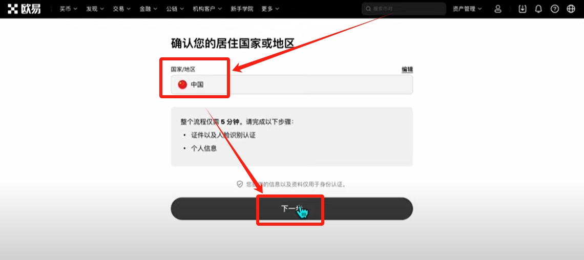 我现在就来到了欧易的官网,首先需要选择一下我们当前的居住地,我这里就选择“中国”,勾选同意,点击【下一步】。