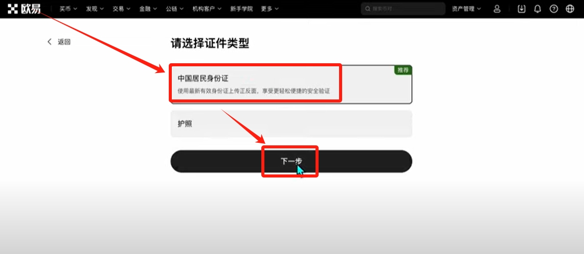 选择一下我们用来认证的证件类型,你可以选择身份件,也可以选择护照。我这里就选择“身份”,点击【下一步】。