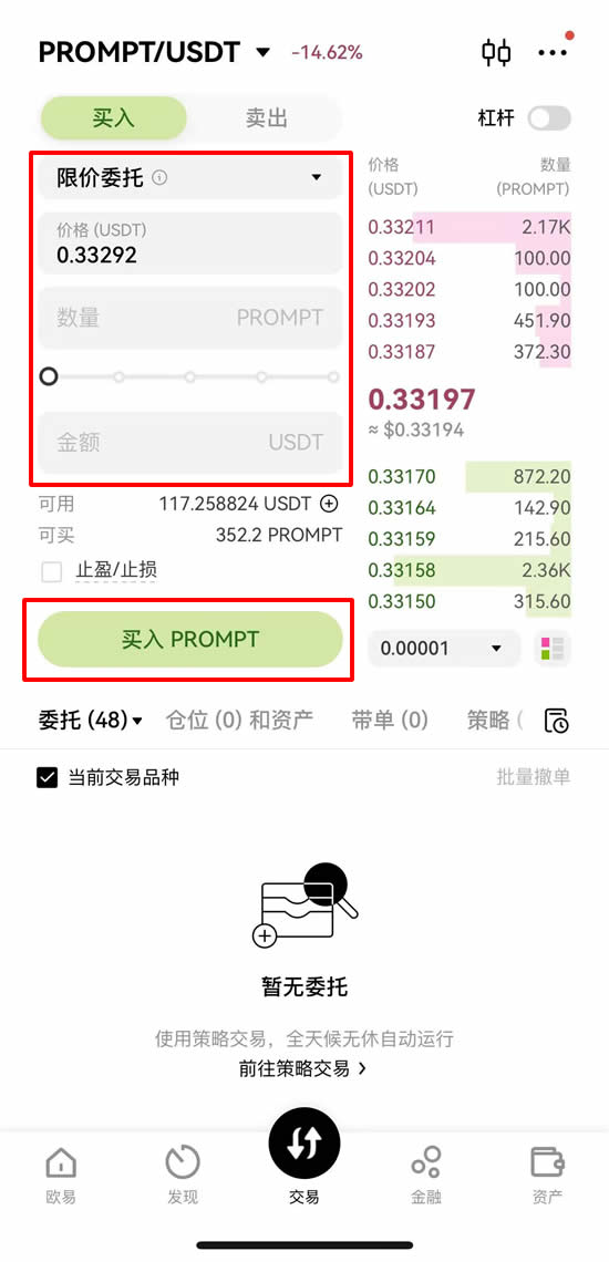 4.根据个人需求设置限价委托参数,填写价格与数量后点击【买入PROMPT】完成交易