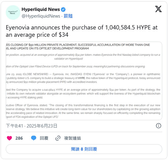 近期HYPE代币获得纳斯达克上市公司EyEnovia斥资3500万美元收购,创下协议单日363万美元回购记录。机构投资者以34美元均价购入超百万枚HYPE,推动代币价格稳定在35美元关键位。