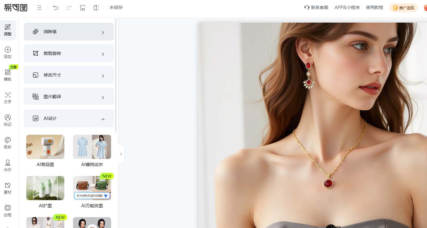2、选择所需功能:按需点击对应工具栏中的功能按钮如:“图片编辑器”、“AI模特试衣”、“AI万能改图”。