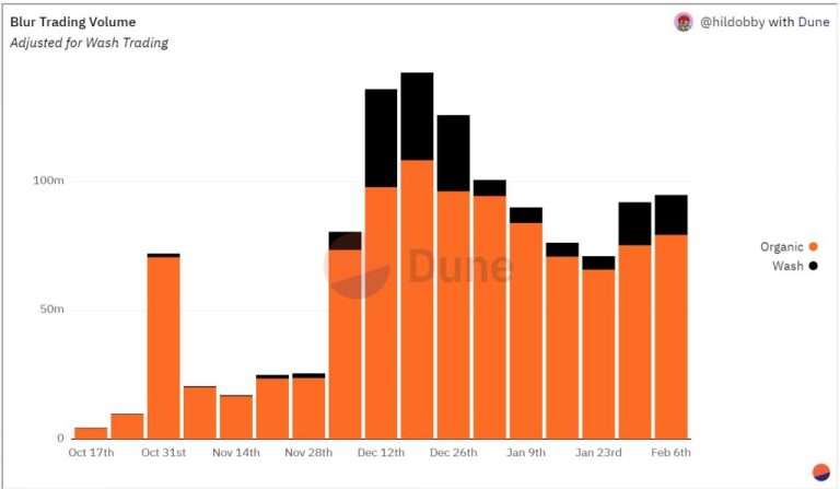 Dune Analytics数据显示,Blur用户中62.6%来自OpenSea迁移,22.3%为新用户。值得注意的是,其89%的交易量为真实需求,刷量行为仅占11%。平台月活用户达52,900,远超同类竞品。