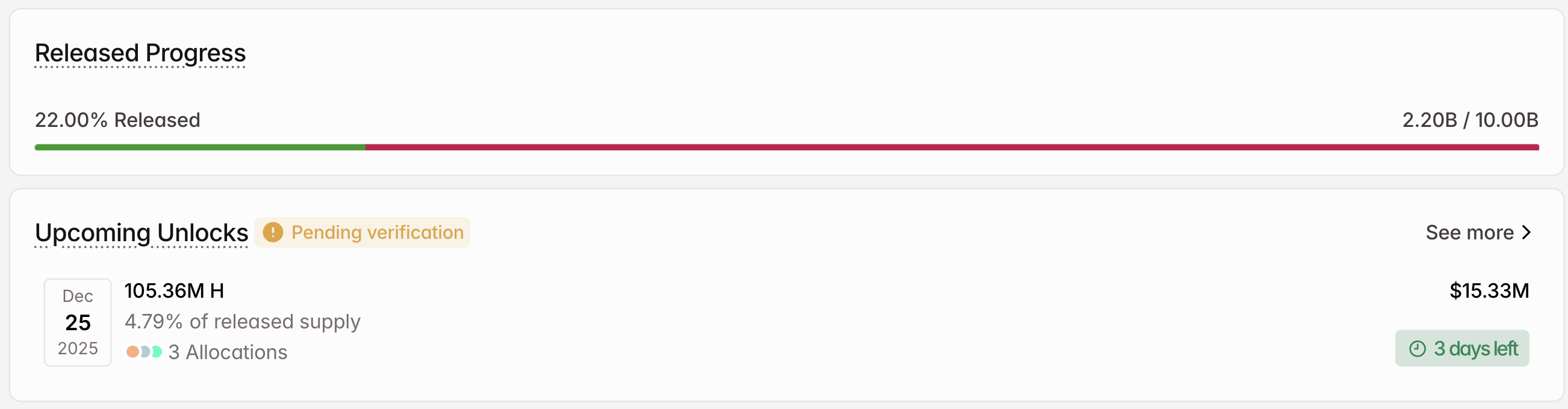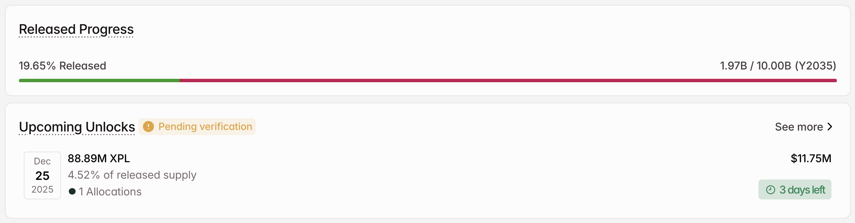 与Humanity类似,Plasma将在圣诞节当日解锁8889万枚代币。这批XPL价值1175万美元,占当前流通量的4.52%。