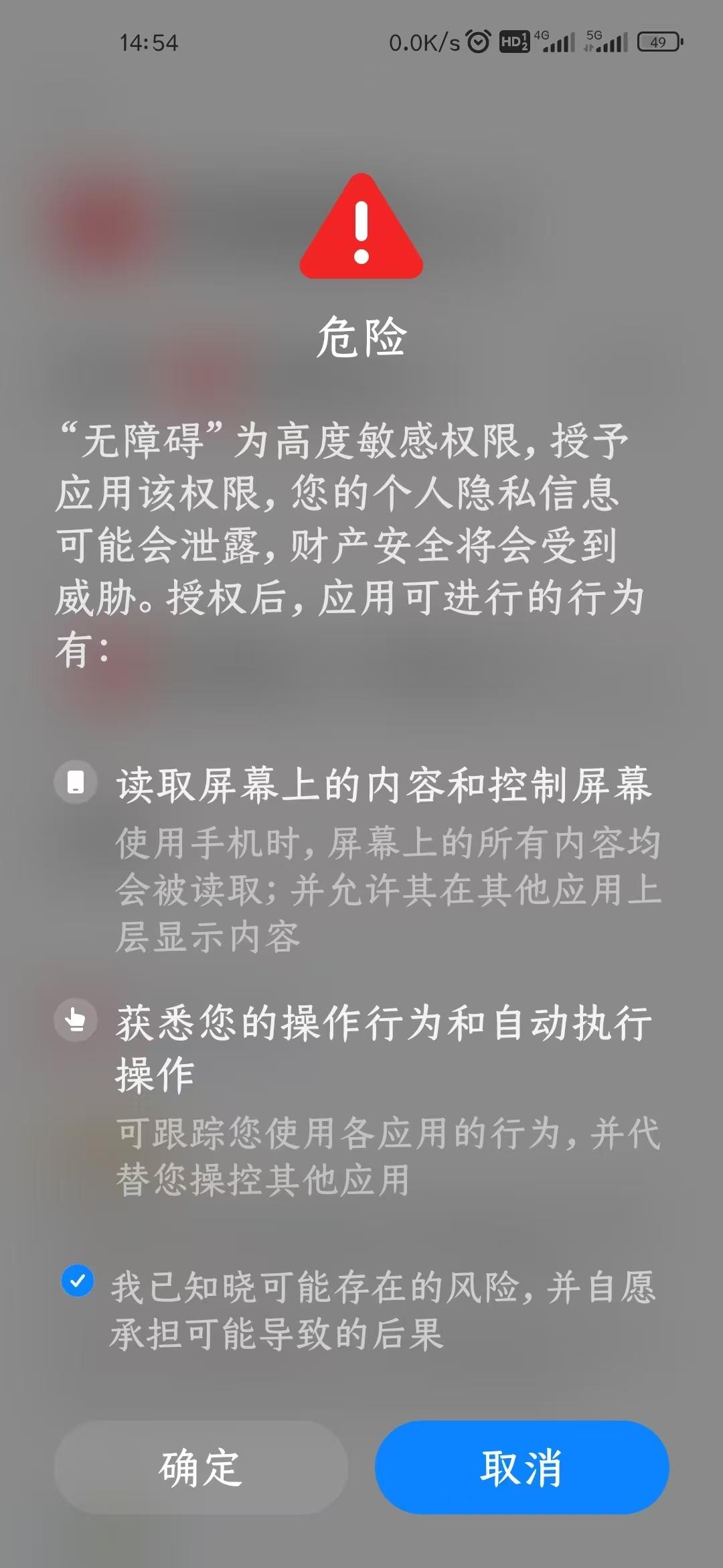 此时,手机会弹出危险提醒,无障碍权限是高敏权限,等待读秒结束后,勾选“我已知晓....”并确认。