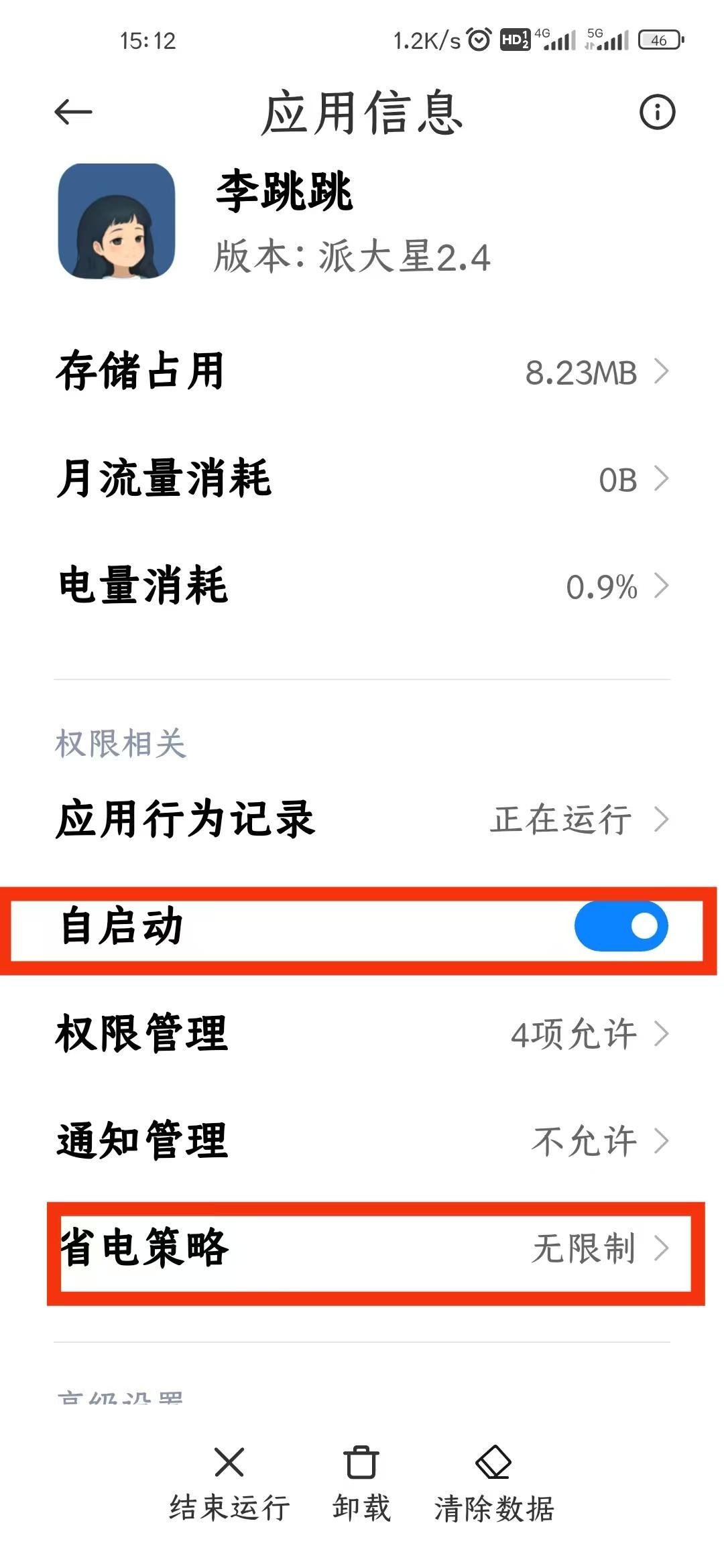 按住【李跳跳】图标,在 应用信息 里,找到 自启动 和 省电策略,并开启权限。