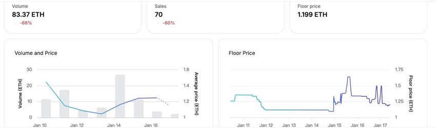 Project AEON系列包含3333个量子故障主题NFT,每个Aeon都被赋予翻转标普500的使命。截至最新数据,该系列周交易额达83.37ETH,地板价稳定在1.199ETH,显示出强劲的市场热度。