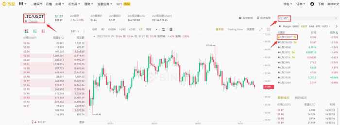 7.搜索LTC/USDT交易对,这是莱特币的标准交易组合