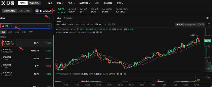 5.搜索LTC并选择LTC/USDT交易对,查看实时行情数据。