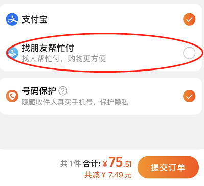 2、在支付页面会有支付宝支付,还有就是找朋友代付,我们选择这个选项。