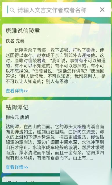 这款应用汇集了大量经典古籍文献与历代诗词作品,堪称移动设备上的“古典文学图书馆”。用户可通过作者姓名分类查找李白、杜甫、李清照等名家诗作,每篇内容均配有详细的白话翻译、注释解析及背景介绍。丰富的资源搭配清晰的结构,使其成为系统学习古代文学的重要平台,特别适合希望深入研读传统经典的读者使用。
