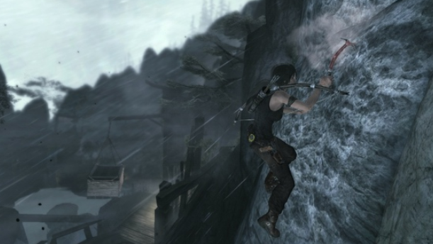 拾取秘宝后,绕行至瀑布后方入口,正式进入古墓内部。进门后使用斧头辅助上攀,点燃初始火把,沿通道前行抵达名为“劣民之坟”的临时营地。洞内陈列多具祭祀用尸体及两座铁质囚笼,右侧笼体为可推动机关——将其推落深渊后,左侧金属升降平台将立即启动上升程序。